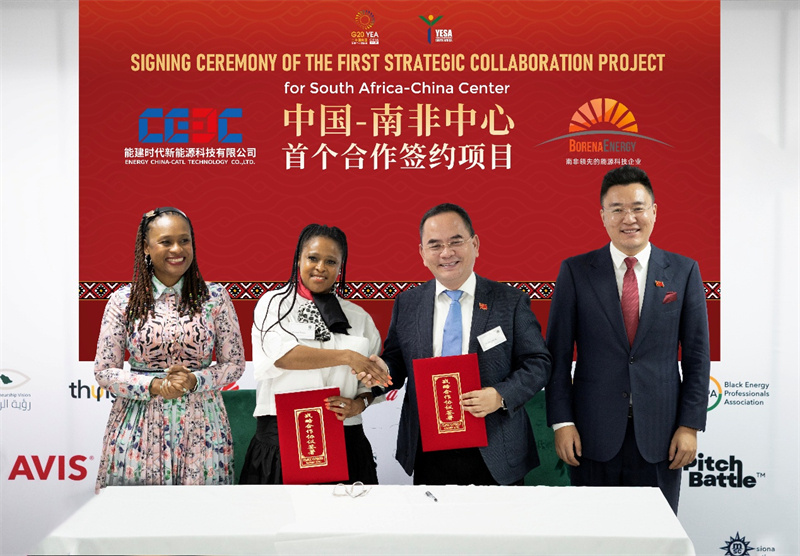 能建時代新能源科技有限公司黨委書記、董事長黃慶豐先生與博雷納能源(Borena Energy)總經(jīng)理莫爾韋西·拉莫尼亞伊-通加(Morwesi Ramonyai-Thonga)女士現(xiàn)場簽約。G20青年企業(yè)家聯(lián)盟中國總部供圖