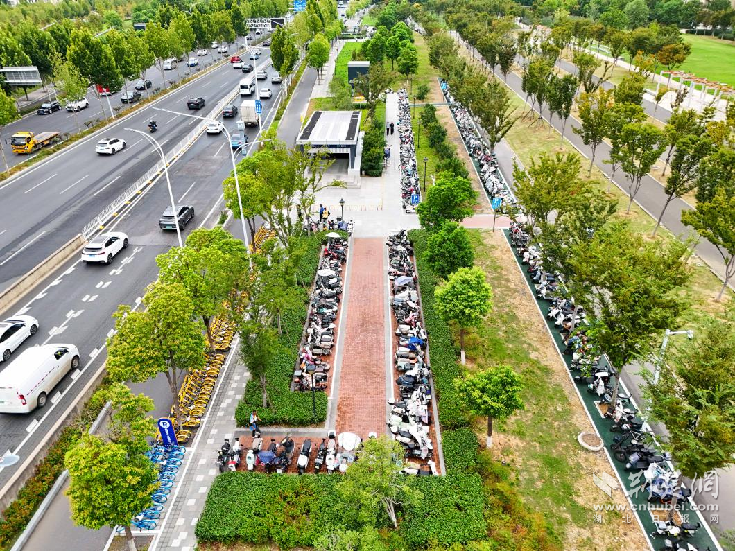 而在不遠處的五環(huán)體育中心站,環(huán)衛(wèi)工李師傅掃完地,順手把一輛歪倒的美團單車扶正,輕輕推進黃色線框內(nèi);幾公里外的常青花園,武漢輕工大學(xué)的學(xué)生袁丁正帶著幾個學(xué)弟學(xué)妹,把幾輛“串門”到電動車區(qū)域的共享單車一一“請”回指定區(qū)域……這些看似尋常的畫面,正是武漢市東西湖區(qū)破解非機動車停車亂象的“治理密碼”。
