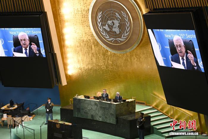 當(dāng)?shù)貢r(shí)間9月25日,紐約聯(lián)合國(guó)總部,巴勒斯坦總統(tǒng)阿巴斯以視頻形式在第80屆聯(lián)合國(guó)大會(huì)一般性辯論中發(fā)言?!≈行律缬浾?陳孟統(tǒng) 攝
