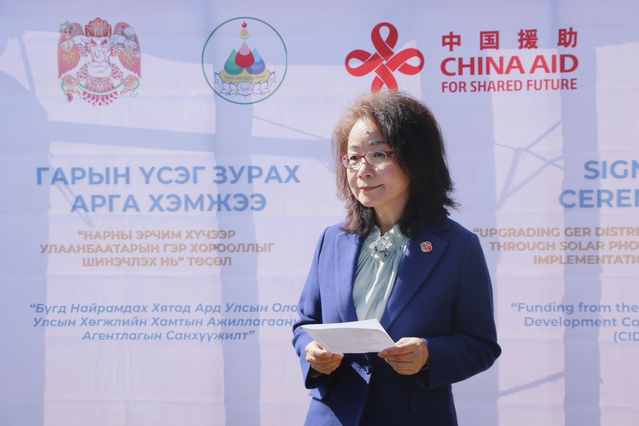中國(guó)駐蒙古國(guó)大使沈敏娟在簽約儀式致辭。中國(guó)駐蒙古國(guó)大使館供圖