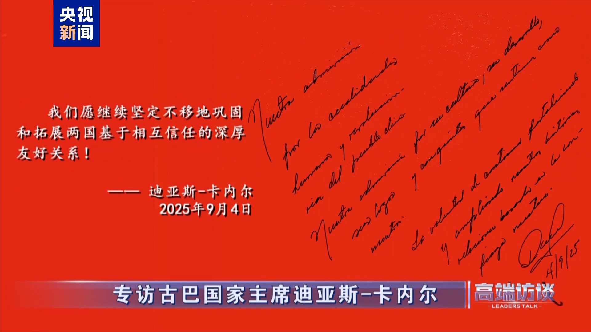 古巴國家主席迪亞斯-卡內(nèi)爾在接受總臺專訪后題詞:
