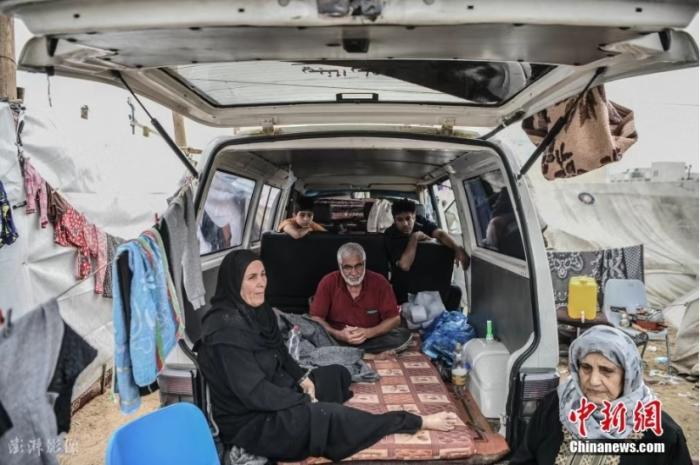 資料圖:加沙汗尤尼斯,巴以沖突持續(xù),當?shù)卦庖陨幸u擊后,流離失所的當?shù)孛癖娫诶щy條件下艱難求生。因家園被摧毀,他們選擇住在汽車內或是搭起的臨時帳篷。