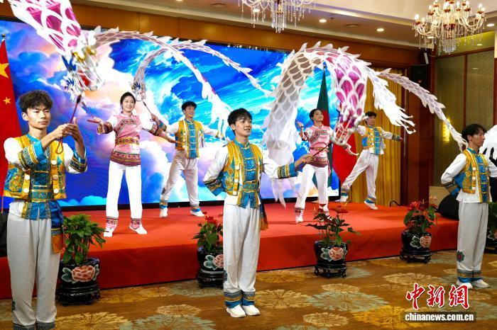 9月26日,慶祝中華人民共和國與孟加拉人民共和國建交50周年招待會現場演出的白族舞蹈《白族彩帶龍》?!×_婕 攝