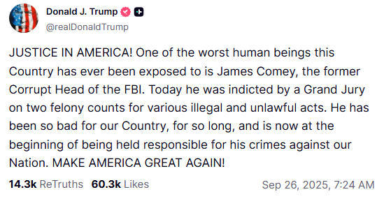 科米被起訴消息公布后,特朗普立即在社交媒體上表示“慶?!保Q科米“長(zhǎng)期以來對(duì)美國(guó)非常壞”,現(xiàn)在“正義終于得到伸張”。就在數(shù)天前,特朗普還在社交媒體上發(fā)帖,抱怨司法部對(duì)科米的調(diào)查遲遲沒有下文,要求盡快對(duì)科米提起訴訟。