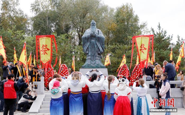 當?shù)貢r間9月28日,第二屆“孔子文化節(jié)”在俄羅斯莫斯科中國貿(mào)易中心舉行。圖為俄羅斯中小學生按照中國傳統(tǒng)禮儀向孔子塑像行禮。中新網(wǎng)記者 田冰 攝