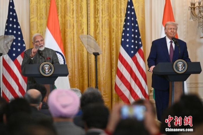當(dāng)?shù)貢r(shí)間2月13日,華盛頓,美國(guó)總統(tǒng)特朗普與來(lái)訪的印度總理莫迪在白宮舉行會(huì)晤。圖為雙方在會(huì)晤后出席聯(lián)合記者會(huì)。中新社記者 陳孟統(tǒng) 攝