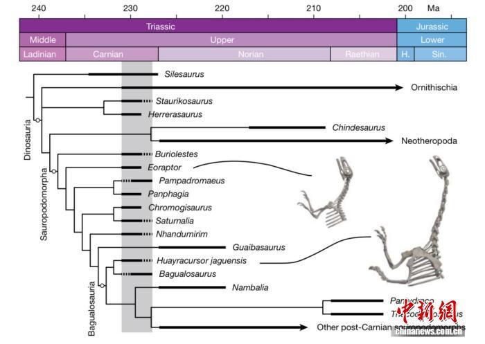 該論文介紹,晚三疊世(約2.37億-2.01億年前)的生態(tài)系統(tǒng)發(fā)生了急劇變化,導(dǎo)致恐龍、哺乳動(dòng)物的早期近親以及包括鱷魚在內(nèi)的動(dòng)物種群崛起和分化??铸?jiān)缙谘莼脑S多證據(jù)都發(fā)現(xiàn)于南美,大部分關(guān)鍵發(fā)現(xiàn)局限于阿根廷和巴西的兩個(gè)盆地地區(qū)。