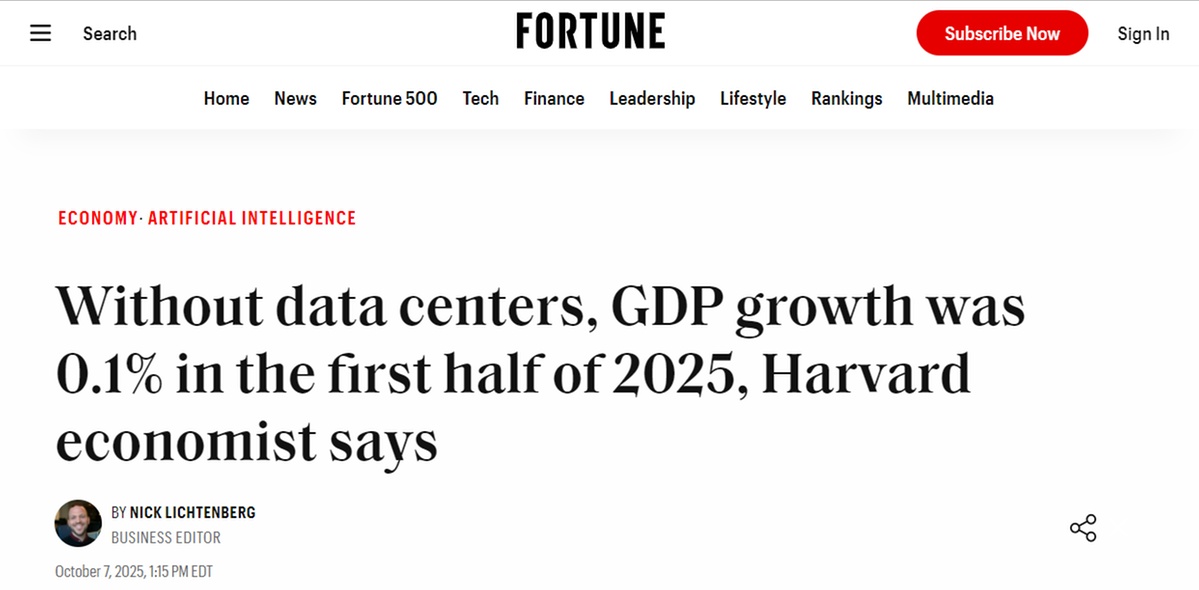 2025年上半年,美國GDP增長幾乎全部依賴數(shù)據(jù)中心和AI投資,其中AI投資占比近92%。哈佛大學經濟學家杰森·弗曼指出,若剔除這一領域,其余產業(yè)合計成長率僅0.1%,幾乎陷入停滯。