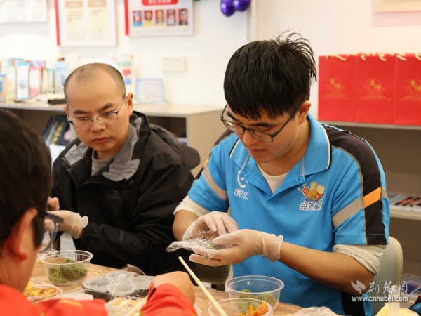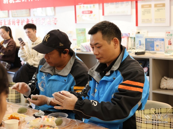 在制作青團(tuán)時(shí),現(xiàn)場(chǎng)同步開展“黃鶴家人茶話會(huì)”,搭建起代際對(duì)話的橋梁?;ǖ躺鐓^(qū)紫陽(yáng)之星小區(qū)黨支部書記金文芳講述了小區(qū)變遷故事,傳遞長(zhǎng)者對(duì)騎手們的關(guān)懷;新就業(yè)群體入黨積極分子樂(lè)倩倩則分享了送餐途中幫扶孤寡老人的暖心經(jīng)歷。兩代人的真誠(chéng)交流深化了情感共鳴,現(xiàn)場(chǎng)洋溢著家人般的溫暖氛圍。