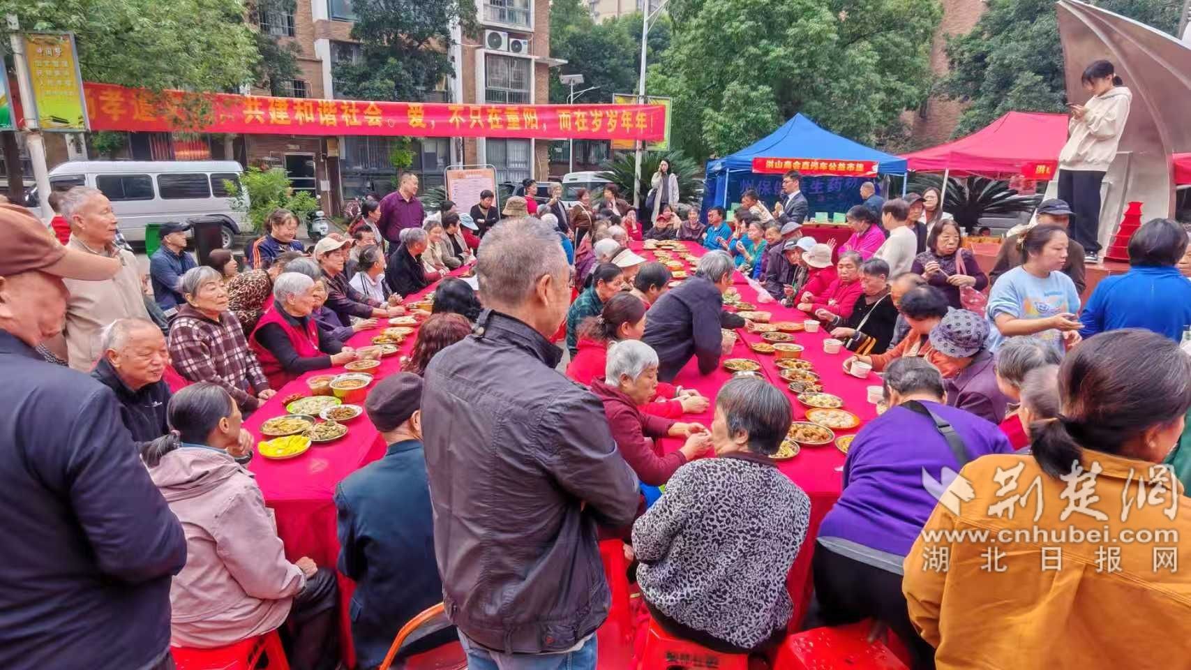 匯演落幕,備受期待的百家宴正式開席。社區(qū)精心籌備的100余道佳肴擺滿餐桌,葷素搭配合理、營養(yǎng)均衡豐富,既有軟糯香甜的傳統(tǒng)糕點,也有鮮香入味的熱菜小炒,更有清爽解膩的時令瓜果,香氣撲鼻惹人垂涎。老人們圍坐一堂,邊細品美食邊拉家常、話趣事,鄰里間你謙我讓、其樂融融,一幅“社區(qū)一家親”的溫馨畫卷。黨員志愿者們穿梭席間,主動為行動不便的老人添菜倒湯,貼心詢問飲食偏好與身體狀況,細致周到的服務讓現場暖意更濃、溫情倍增。
