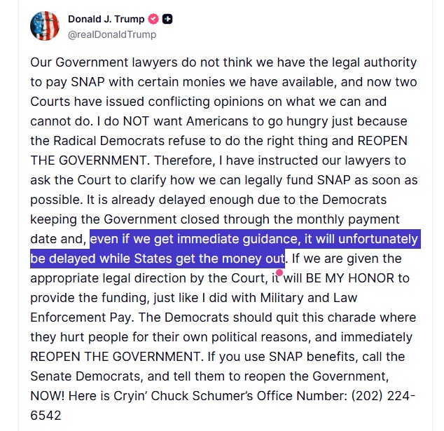△當?shù)貢r間10月31日,美國總統(tǒng)特朗普就“補充營養(yǎng)援助計劃”發(fā)表聲明。特朗普再次指責是民主黨導致政府“停擺”,最終招致美國民眾忍饑挨餓。