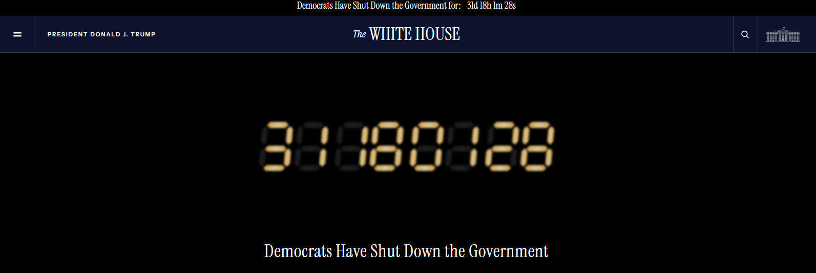 截至美東時間11月1日18時(北京時間11月2日6時),美國白宮官網(wǎng)實時刷新紀錄的這次美國政府“停擺”已經(jīng)持續(xù)了31天零18個小時。在白宮官網(wǎng)的頁面上,寫有“民主黨人關停了政府”的字樣。