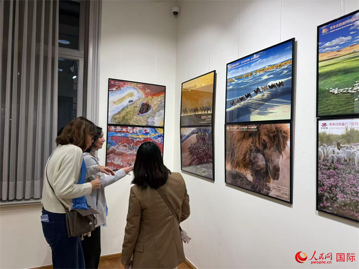 布魯塞爾的秋日午后,馬頭琴曲《天邊》的悠揚旋律在文化中心大廳回蕩,與展廳內的影像畫面交相輝映。渾厚悠長的《蒼天般的阿拉善》樂聲,映襯著巴丹吉林沙漠的全景圖片,令人仿佛置身大漠深處。提前到場的嘉賓們饒有興致地翻閱文旅手冊與遺產保護資料,對這片來自中國北疆的神奇土地充滿好奇與期待。
