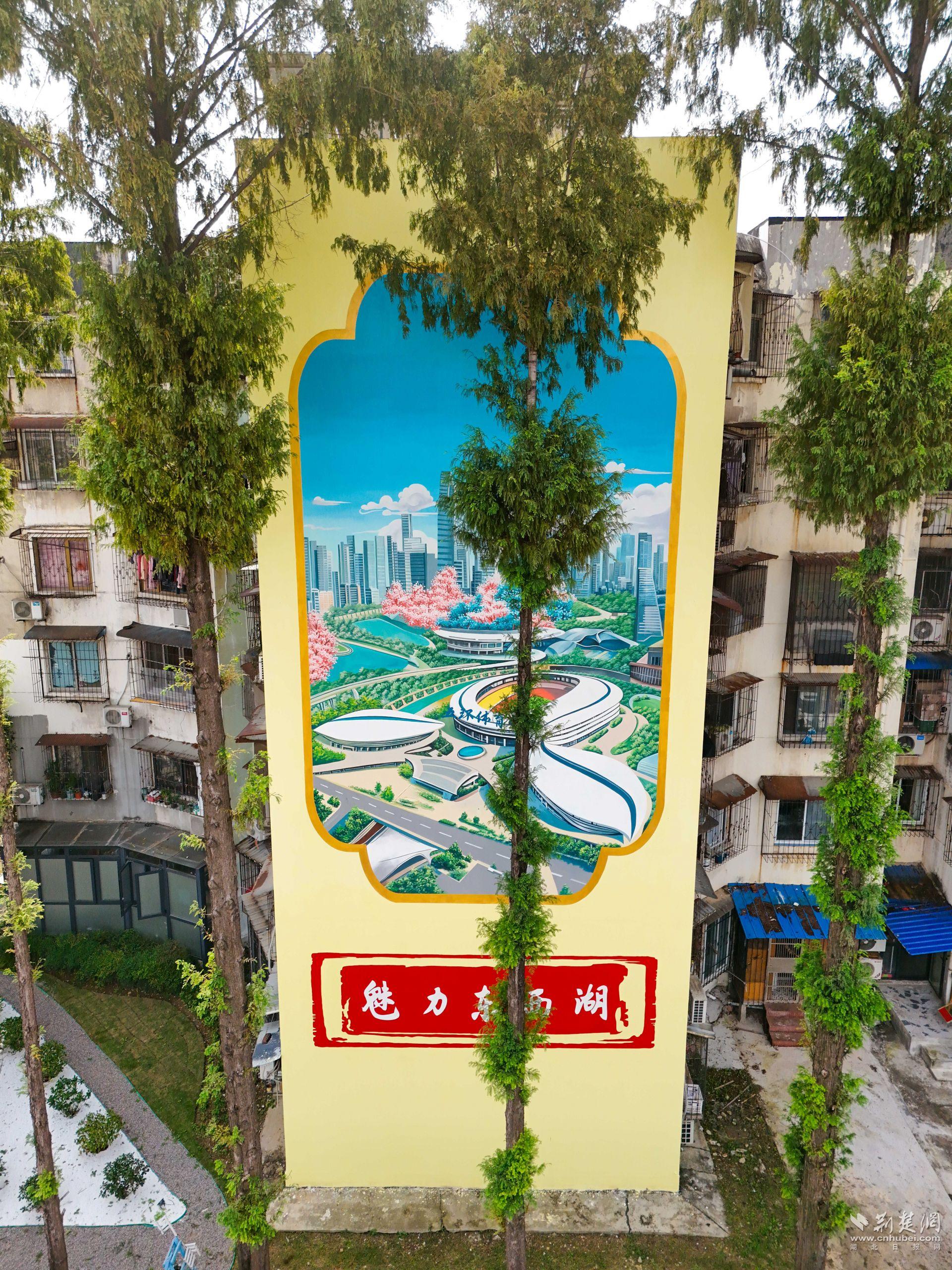圍墻和彩繪也成了亮點。專業(yè)團隊在相鄰居民樓外墻繪制325平方米主題壁畫——一面呈現(xiàn)“魅力東西湖”的城市風(fēng)貌,一面展現(xiàn)“幸福新常青”的生活圖景,成為社區(qū)新地標(biāo)。