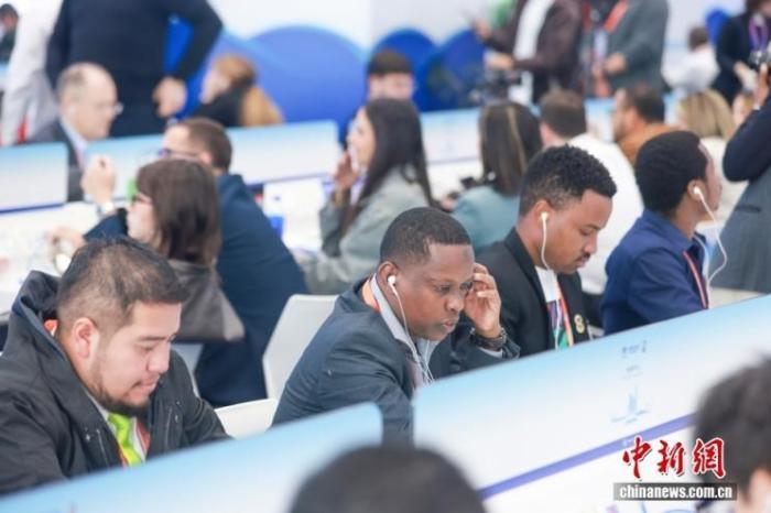 11月5日,第八屆中國國際進(jìn)口博覽會暨虹橋國際經(jīng)濟(jì)論壇開幕式在國家會展中心(上海)舉行。圖為外國媒體記者在新聞中心收聽開幕式上的嘉賓發(fā)言。中新社記者 賈天勇 攝