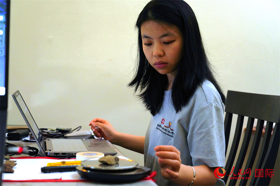 中方隊(duì)員彭勝藍(lán)對2025年調(diào)查石制品進(jìn)行測量統(tǒng)計(jì)。人民網(wǎng)記者 黃煒鑫攝