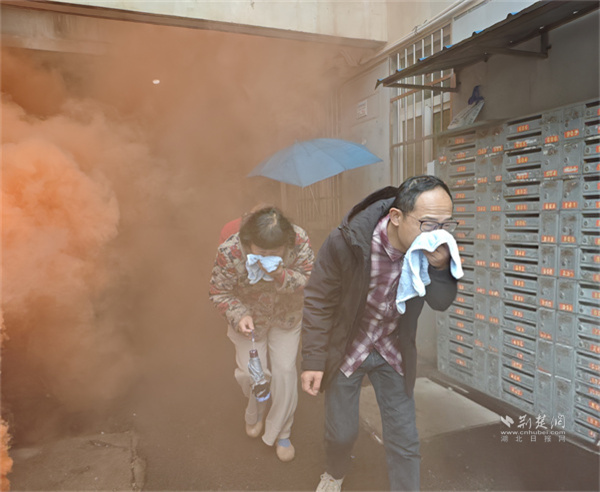 隨后,6棟居民樓模擬火災(zāi)疏散演練啟動?!盁熿F彈點燃!滅火組壓制初期火源,疏散組組織撤離!”指令下達(dá)后,滅火組迅速攜帶器材沖進(jìn)樓道撲救模擬起火點;疏散組手持熒光指揮棒,在樓層樓梯口、轉(zhuǎn)角處布控,引導(dǎo)居民彎腰捂鼻、有序撤離。