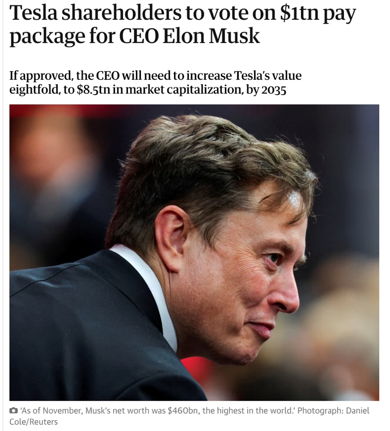△《衛(wèi)報(bào)》報(bào)道,如馬斯克薪酬方案獲特斯拉股東大會(huì)批準(zhǔn),他將可能成為首位萬億富翁