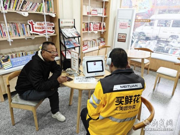 外賣(mài)小哥在“聽(tīng)書(shū)角”聽(tīng)書(shū)。 通訊員供圖