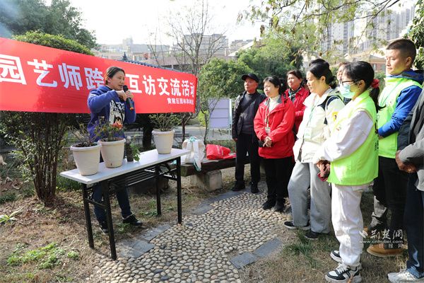 當(dāng)天,社區(qū)園藝師跨區(qū)互訪交流活動在沙港社區(qū)舉行,來自全市各區(qū)的28名社區(qū)園藝師與沙港社區(qū)志愿者,通過實(shí)地探訪、動手實(shí)操、互動分享,圍繞社區(qū)花墻打造、秋冬季病蟲害防治等話題展開深度交流,在互學(xué)互鑒中共同提升園藝服務(wù)水平。