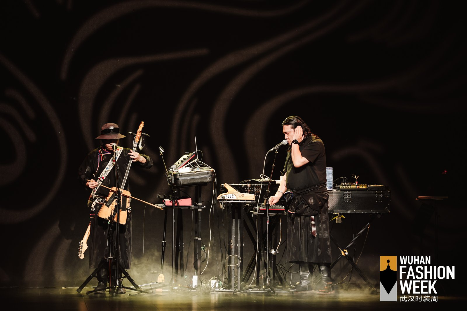陳宇攜手Taiga樂(lè)隊(duì),把錫林郭勒草原的晨霧、馬頭琴與電子節(jié)拍轉(zhuǎn)化成可行走的時(shí)裝音景。可持續(xù)植物素皮、流蘇與繩結(jié)形成呼應(yīng),讓游牧精神在當(dāng)代廓形中保持自由。