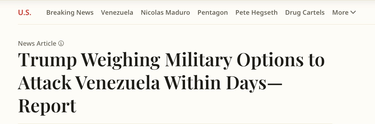 △美國《新聞周刊》報(bào)道,特朗普正在權(quán)衡于數(shù)日內(nèi)對委內(nèi)瑞拉發(fā)起軍事打擊。