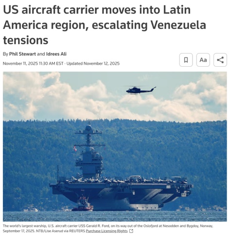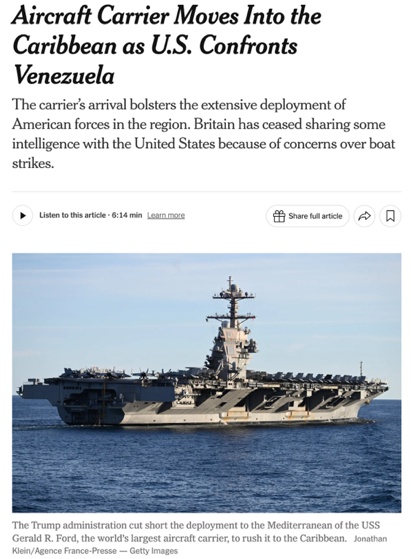 △《紐約時(shí)報(bào)》報(bào)道,美國最先進(jìn)的“福特”號航母日前進(jìn)入加勒比海區(qū)域,美國政府正在考慮采取進(jìn)一步軍事行動(dòng),旨在推翻馬杜羅政權(quán)。