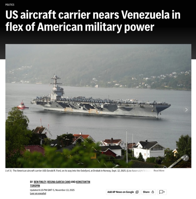 △美聯(lián)社報(bào)道,“福特”號航母將在數(shù)日內(nèi)抵達(dá)委內(nèi)瑞拉近海,美國的這種軍事力量展示,在拉美已有數(shù)代人未曾見過。