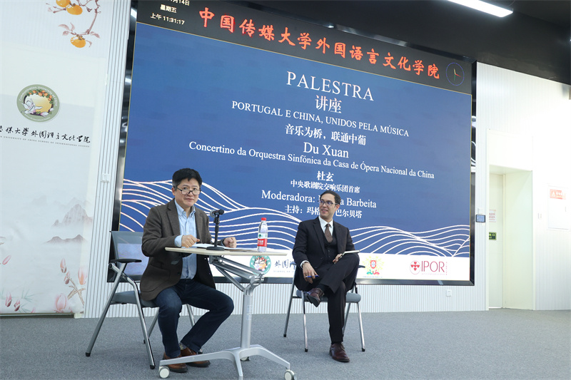 中央歌劇院交響樂(lè)團(tuán)首席杜玄(左)與葡萄牙駐華使館教育及文化專員路易斯·佩斯塔納(右)進(jìn)行分享?;顒?dòng)主辦方供圖