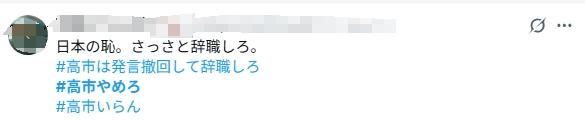 在社交媒體平臺上,出現(xiàn)了“高市辭職”“高市住手”“請高市撤回發(fā)言”等多個標(biāo)簽。日本網(wǎng)民紛紛表示,高市的錯誤言論給日中關(guān)系埋下隱患,希望她盡快道歉。