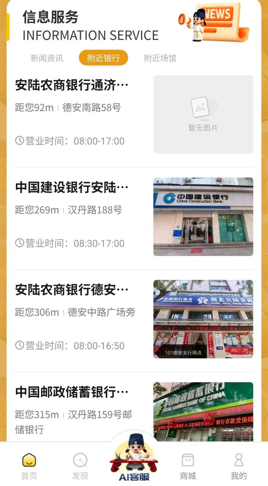 作為安陸市重點(diǎn)打造的智慧文旅服務(wù)載體,平臺依托現(xiàn)代信息技術(shù),將全市各類支付服務(wù)網(wǎng)點(diǎn)信息全面整合,形成“支付網(wǎng)點(diǎn)一張圖”數(shù)字化服務(wù)矩陣。游客只需打開“一碼游安陸”微信小程序,在首頁的信息服務(wù)板塊即可實(shí)時查看周邊銀行網(wǎng)點(diǎn)、助農(nóng)取款點(diǎn)等位置分布、服務(wù)范圍及運(yùn)營狀態(tài),通過一鍵導(dǎo)航功能快速抵達(dá),輕松滿足現(xiàn)金取款、掃碼支付、業(yè)務(wù)辦理等各類需求,徹底告別“找網(wǎng)點(diǎn)難、支付不便”的出行困擾。