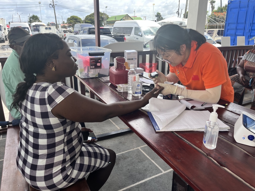 援圭亞那中國醫(yī)療隊隊員為當(dāng)?shù)孛癖娺M(jìn)行血糖檢測。第21批援圭亞那中國醫(yī)療隊供圖