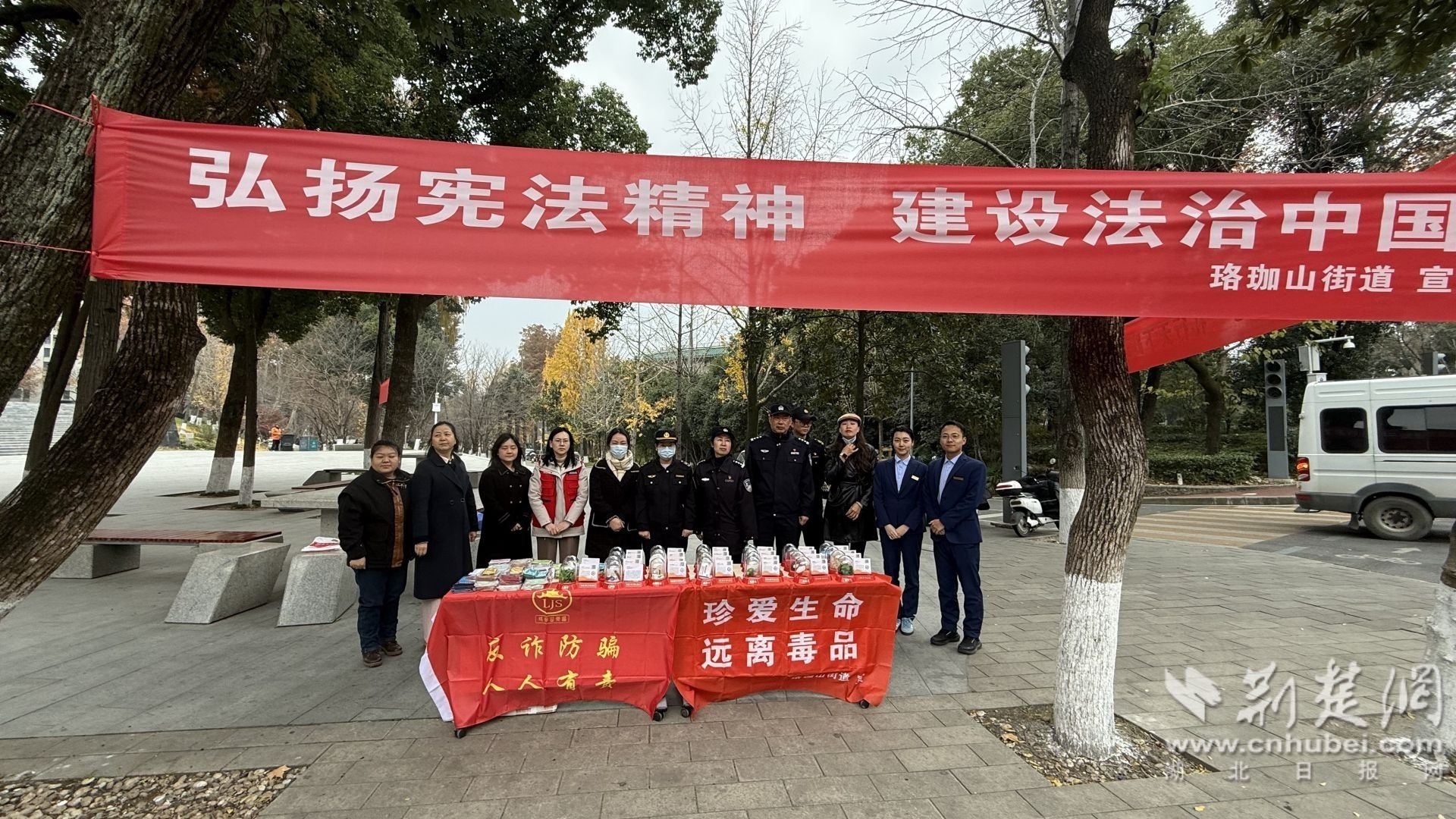 荊楚網(wǎng)(湖北日?qǐng)?bào)網(wǎng))訊(通訊員 方茜)12月4日,武昌區(qū)珞珈山街道聯(lián)合武漢大學(xué)保衛(wèi)部、轄區(qū)派出所、司法所、執(zhí)法隊(duì)等多部門(mén),在武漢大學(xué)萬(wàn)林藝術(shù)博物館門(mén)前舉辦“憲法宣傳周”暨國(guó)家憲法日集中宣傳活動(dòng)。本次活動(dòng)以“憲法守護(hù)健康權(quán),禁毒筑牢生命線”為主題,旨在弘揚(yáng)憲法精神,增強(qiáng)全民法治觀念,同時(shí)深化禁毒宣傳教育,筑牢校園與社會(huì)禁毒防線。