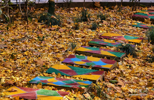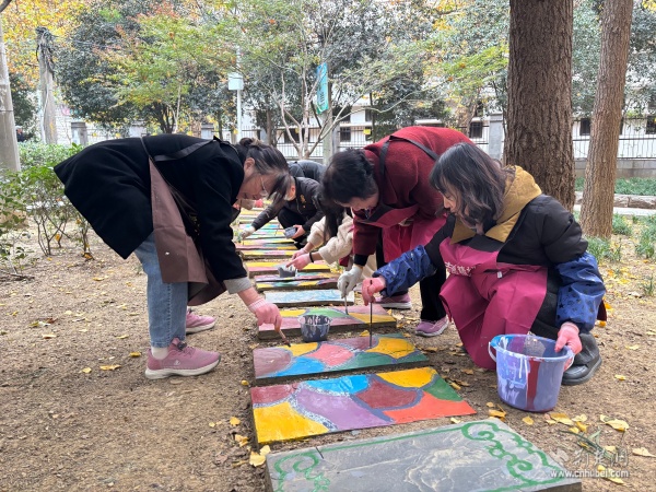 30余名黨員與社區(qū)居民攜手執(zhí)筆,在社區(qū)能人的指導(dǎo)下,依據(jù)設(shè)計(jì)圖稿細(xì)心勾勒線條,精心調(diào)配赭石、石青、石綠等傳統(tǒng)礦物色彩,悉心填充花瓣、枝葉。草坪里原本素樸的地磚漸漸綻放出繽紛圖景:象征革命精神的紅色印記、勾勒武昌古城風(fēng)貌的文化符號,以及依循“十二花令”鋪陳的水仙、桃花、菊花等時令花卉與梅蘭竹菊的清雅風(fēng)骨藝術(shù)化呈現(xiàn)。