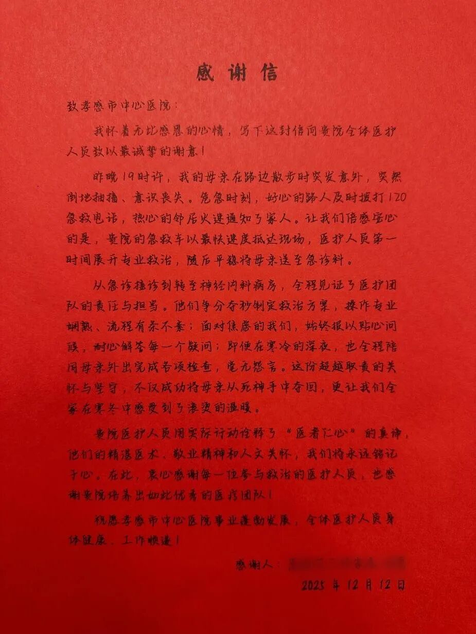 這封感謝信,不僅是對(duì)孝感市中心醫(yī)院醫(yī)護(hù)團(tuán)隊(duì)的最高褒獎(jiǎng),更是這個(gè)冬天里,醫(yī)患關(guān)系最溫暖的注腳。