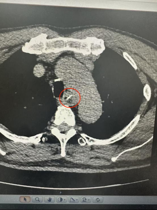 下午6時,程先生匆忙前往湖北航天醫(yī)院急診科就診。醫(yī)生檢查發(fā)現(xiàn)其口咽部及咽喉部未見異物,立即安排胸部CT檢查。