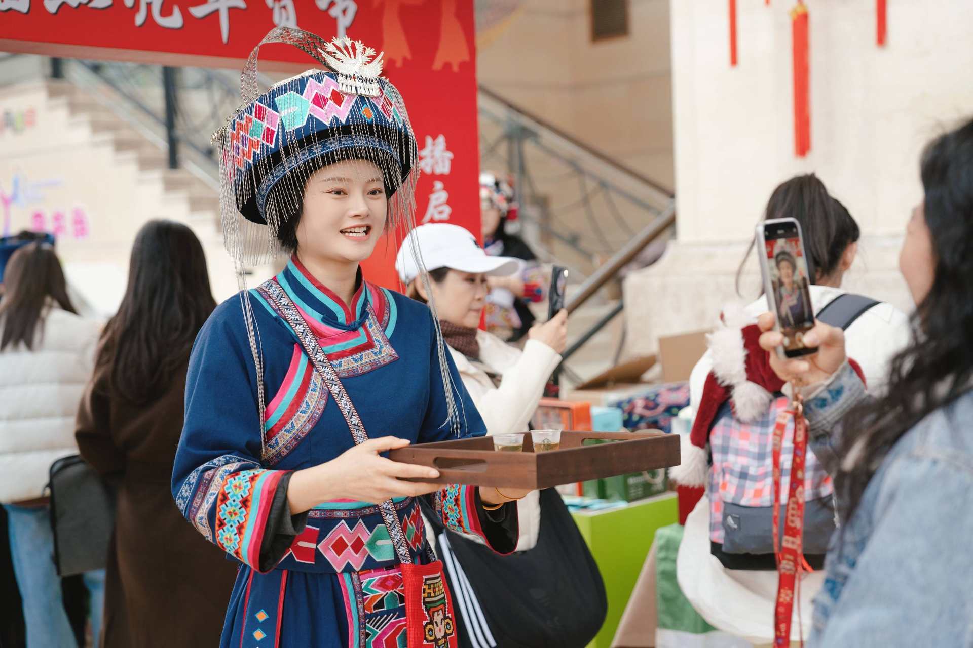 活動(dòng)尚未正式開幕,極具穿透力的土家歌曲便已“先聲奪人”。身著刺繡銀飾、五彩盛裝的土家阿妹,以原生態(tài)清甜的嗓音裹挾著武陵山區(qū)的清風(fēng),瞬間將每一位踏入會(huì)場的嘉賓“拽”進(jìn)了千里之外的土家村寨。