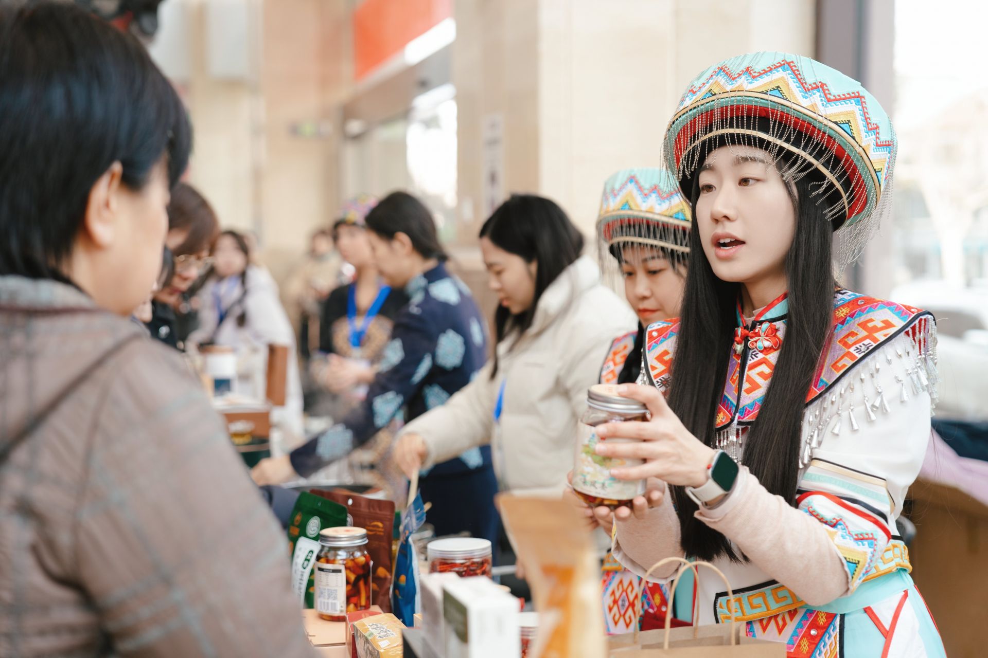 “這個(gè)香腸嚼著香,再給我裝兩斤!”“臘肉聞著就流口水,正宗土家味!”“有機(jī)山茶油好,既能炒菜又能護(hù)膚,給家里老人帶兩瓶!”贊嘆聲、詢價(jià)聲、掃碼支付聲此起彼伏,各個(gè)展臺(tái)前都排起了小隊(duì)。這些來自武陵山區(qū)的天然物產(chǎn),輔以傳統(tǒng)工藝制作,成為現(xiàn)場最搶手的“香餑餑”。此外,刺繡香包、竹編工藝品等非遺手作也備受青睞。