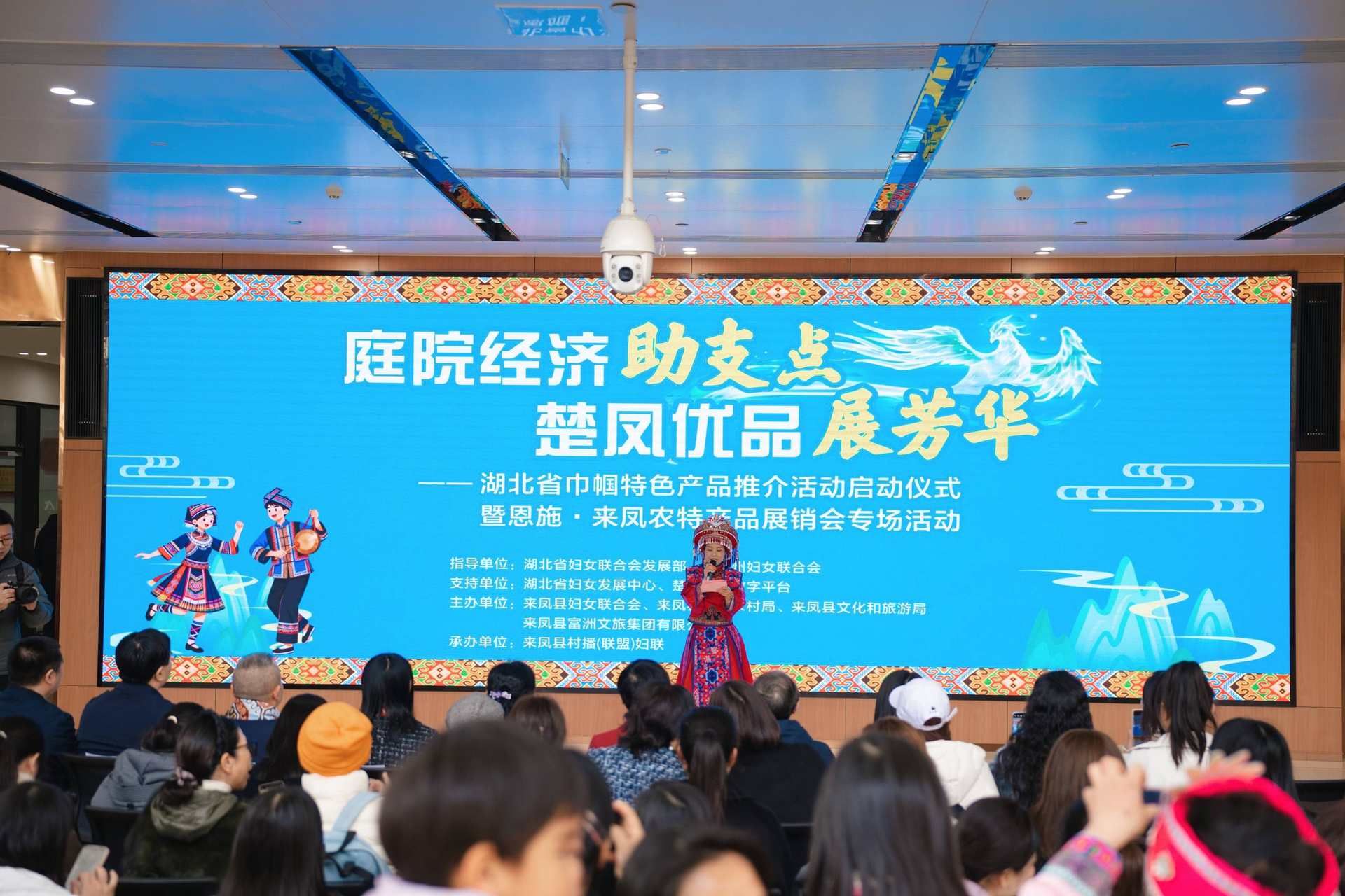 “‘庭院經(jīng)濟(jì)助支點(diǎn) 楚鳳優(yōu)品展芳華’湖北省巾幗特色產(chǎn)品推介活動(dòng)啟動(dòng)!”隨著省婦聯(lián)領(lǐng)導(dǎo)的話音落下,歡快的擺手舞旋律響徹全場?,F(xiàn)場觀眾與舞者攜手共舞,感受土家族“以舞會(huì)友”的獨(dú)特待客之道。