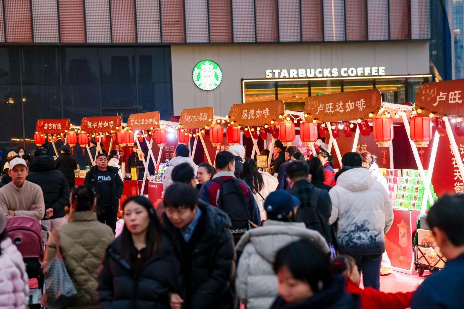 國(guó)際廟會(huì)作為核心亮點(diǎn),匯聚數(shù)十家特色商戶,構(gòu)建微縮“全球風(fēng)味檔案館”。8米巨型跨年蛋糕帶來(lái)儀式感打卡體驗(yàn),意大利歐蒂姆起泡酒、盧旺達(dá)咖啡等國(guó)際飲品與榮獲IIAC國(guó)際金獎(jiǎng)的易捷咖啡拼配豆同臺(tái)亮相,精釀啤酒、創(chuàng)意雞尾酒與本土精品咖啡形成復(fù)合消費(fèi)場(chǎng)景。米婆婆將中式酒釀與西式咖啡創(chuàng)意融合,美團(tuán)歪馬送酒帶來(lái)本土化改良的熱紅酒文化,展現(xiàn)全球潮流與本土創(chuàng)新的深度碰撞。