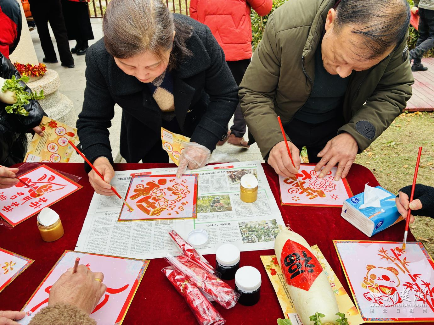 手工體驗區(qū)則充滿了濃厚的文化韻味,大家在志愿者的指導下,將雕刻著不同書體“?!弊峙c馬年吉祥紋樣的模板,小心翼翼拓印在紅色宣紙上。當一幅幅帶著墨香的福字躍然紙上,不僅定格了傳統(tǒng)技藝的獨特魅力,更承載著大家對新年福氣盈門的美好期盼?!拔彝亓艘粋€‘?!?,打算帶回家貼在門上,希望新的一年全家都福氣滿滿!”一位年輕媽媽舉著自己的作品,開心地分享道。