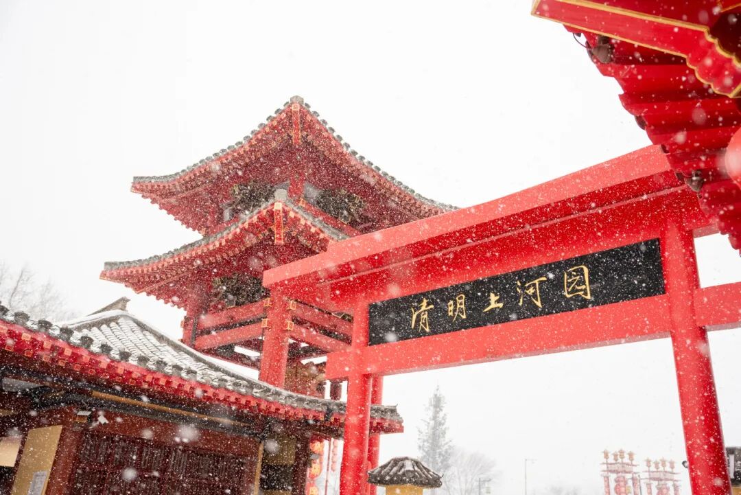 當(dāng)雪花開始飄落,開封便不再是開封,它成了那個(gè)魂?duì)繅衾@的汴京。而清明上河園,也化作了一幅雪景版的《清明上河圖》,仿佛一位洗凈鉛華的古典美人,以其獨(dú)有的靜謐絕色,向每一位喜歡雪的人發(fā)出邀請(qǐng):此刻的清園,更值得一來。