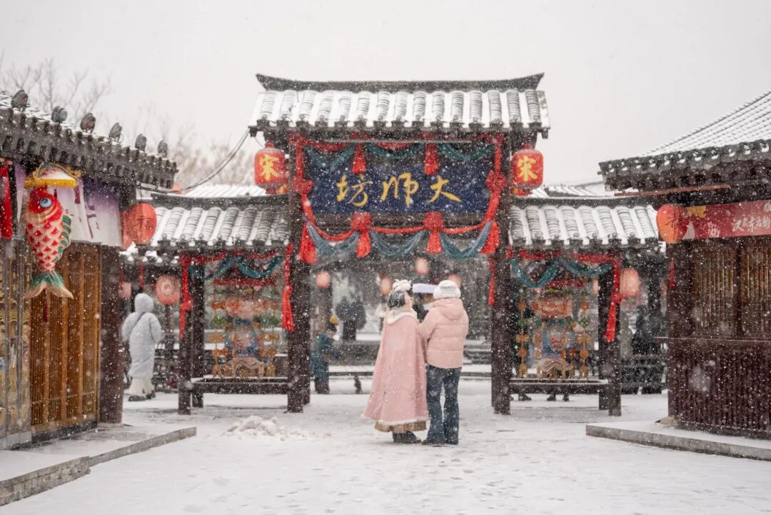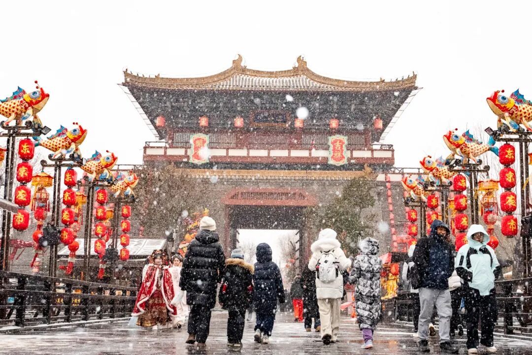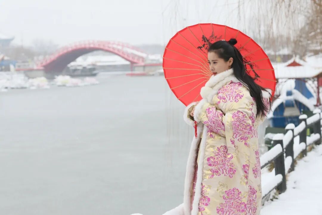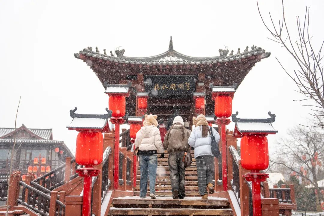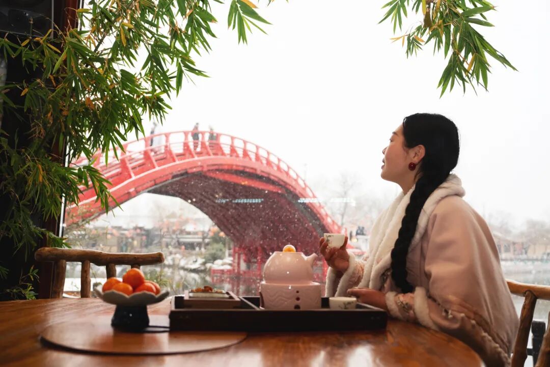 也可以換一身素雅的漢服,漫步在虹橋之上,讓雪花綴滿肩頭,融入雪景版的《清明上河圖》,與千年風(fēng)雅撞個(gè)滿懷。