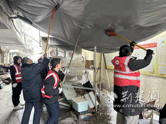 除雪過程中,工作人員發(fā)現(xiàn)一處老舊小區(qū)宿舍門前遮雨棚因積雪堆積嚴(yán)重變形,存在垮塌隱患。大家立即分工協(xié)作,有的手持長(zhǎng)桿清理棚頂積雪,有的在下方拉起警戒線、疏導(dǎo)居民通行,及時(shí)消除了高空墜物風(fēng)險(xiǎn),為居民撐起一把“安全傘”。