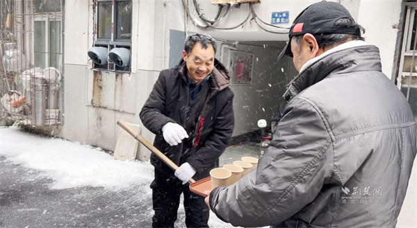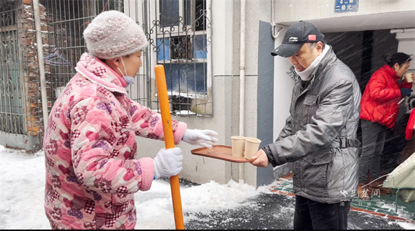 “大家歇一歇,喝點姜茶暖暖身子!”正當眾人干勁十足時,一位黨員居民端著熱氣騰騰的姜茶走來,將暖茶遞到每個人手中?!拔壹依习橹匕Y需要照顧,沒辦法和大家一起出力,只能煮點熱茶讓大家暖和一下?!币槐?、一聲問候,凝聚起鄰里間最真摯的情誼,為掃雪行動更添溫情。