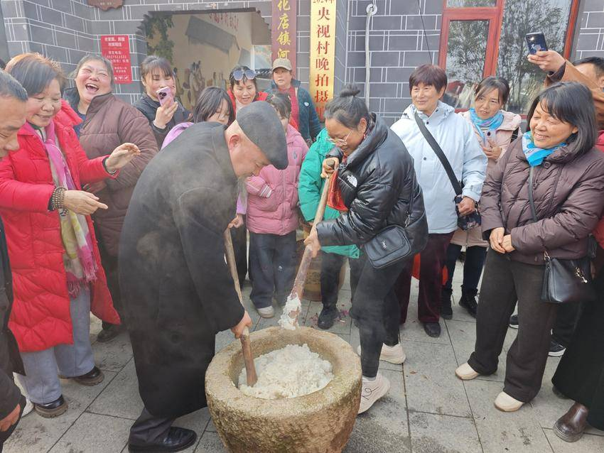 宣化店鎮(zhèn)河西村楊灣,游客沉浸式觀看大型行進式紅色情景劇《1946?中原突圍》,在槍聲音效與實景中,重溫烽火歲月。在“新春祈福墻”前,游客們提筆寫下“國泰民安”“鄉(xiāng)村振興”等新春愿望。在中原軍區(qū)舊址前,工作人員為游客送上“紅色新春賀卡”。傳統(tǒng)年俗體驗區(qū),舞獅、龍船等非遺表演輪番登場,游客們舉起手機記錄下這喜慶瞬間,游客們親手書寫春聯(lián),拓印福字,制作竹燈籠,將滿滿的年味帶回家。游客們跟著村民一起打糍粑,滿滿的鄉(xiāng)村煙火氣。
