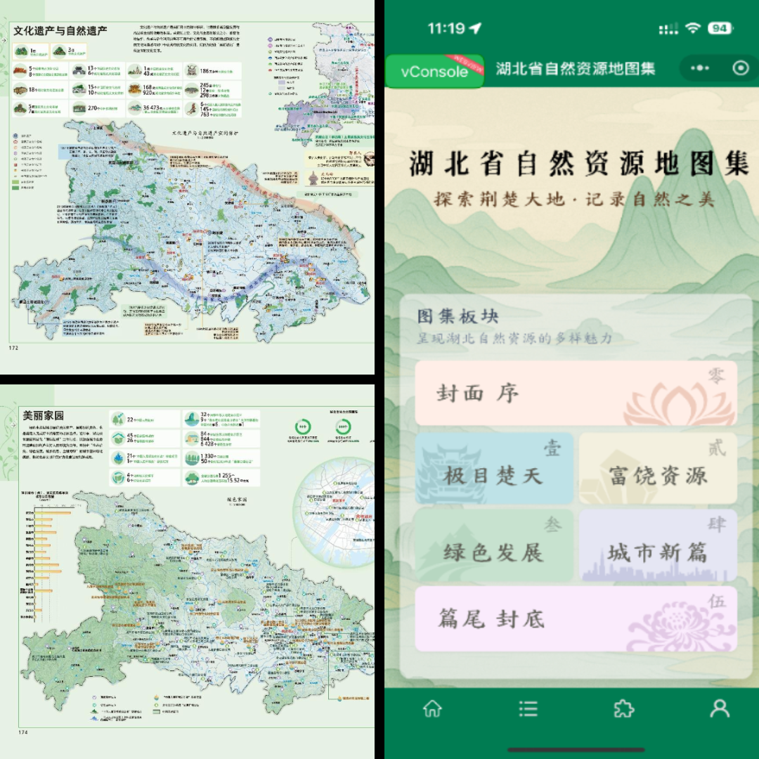 不同于傳統(tǒng)專題圖集,《湖北省自然資源地圖集》采用“自然稟賦 → 綠色發(fā)展 → 城市新篇” 為核心脈絡(luò),構(gòu)建了一個(gè)富有哲學(xué)深度和實(shí)踐導(dǎo)向的敘事閉環(huán),使“綠水青山”的價(jià)值可感、可及、可用。圖集創(chuàng)造性兼顧決策支持、管理參考、學(xué)術(shù)研究與公眾科普多重目標(biāo),此外,通過同名微信小程序的創(chuàng)新開發(fā),將專業(yè)圖集內(nèi)容靈活裁剪、免費(fèi)開放,讓普通群眾得以直觀感悟湖北自然資源稟賦和生態(tài)建設(shè)成就,在指尖間領(lǐng)略湖北實(shí)踐。