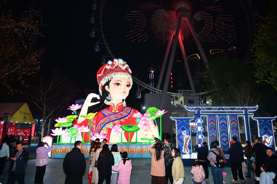 其中,極具宜昌本土特色的“西蘭卡普”燈組的更是成為燈會(huì)“流量擔(dān)當(dāng)”:該燈組以土家族傳統(tǒng)織錦西蘭卡普為靈感,采用“通經(jīng)斷緯”的傳統(tǒng)技藝元素進(jìn)行燈組設(shè)計(jì),色彩艷麗、圖案精美,生動(dòng)再現(xiàn)了土家織錦的獨(dú)特魅力。身著特色土家服飾的NPC們載歌載舞,不時(shí)邀請(qǐng)現(xiàn)場(chǎng)游客一同參與互動(dòng),手把手傳遞土家舞蹈的柔美與靈動(dòng),讓游客在沉浸式體驗(yàn)中感受土家民俗的深厚底蘊(yùn)。另一組重點(diǎn)燈組“宜昌非遺+十二生肖”,則將西陵剪紙、枝江皮雕等宜昌非遺技藝與十二生肖元素巧妙結(jié)合,每一個(gè)生肖造型都融入了非遺紋樣,十二生肖躍然燈上,特別是馬兒靈動(dòng)矯健,引得孩童駐足歡呼:“這匹馬像會(huì)跑出來(lái)一樣!太神了!”