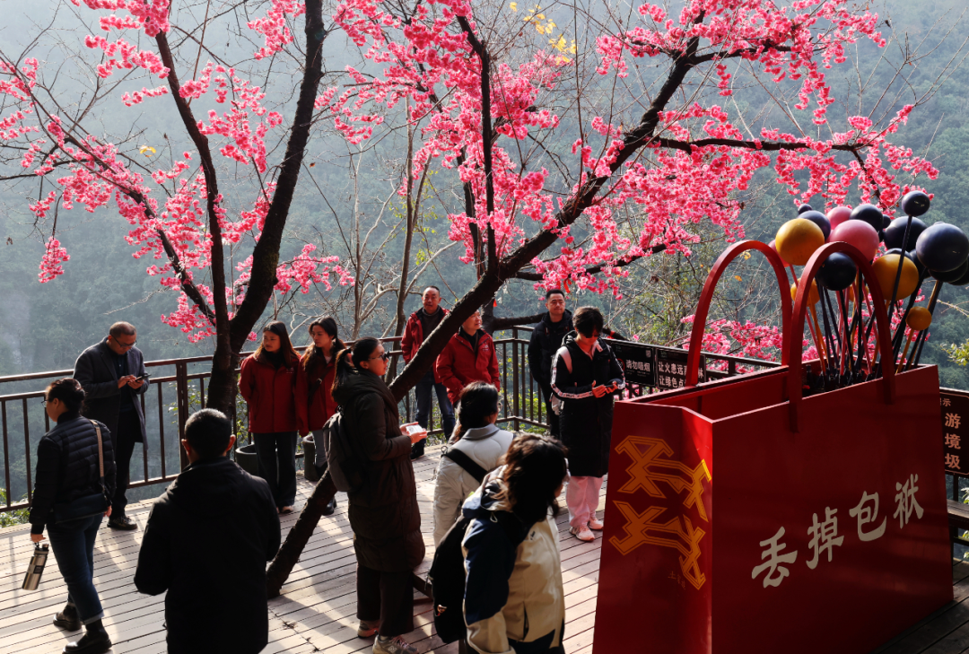 景區(qū)內(nèi),玻璃橋上歡呼聲此起彼伏,絕壁棧道上游客們舉家拍照打卡,地心谷底的潺潺流水與游客的歡聲笑語交織成一幅熱鬧的新春畫卷。