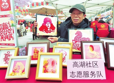 剪紙技藝非遺傳承人朱兵華展示他的剪紙作品。